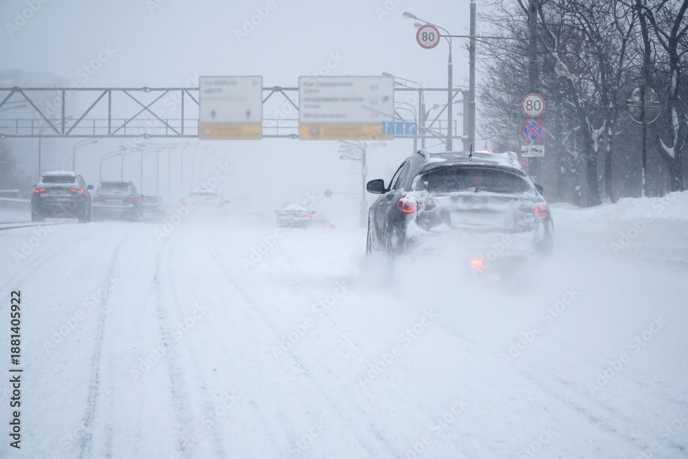 Cars drive on a snow-covered road during a snowfall.