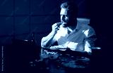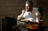 Businessman working late at office desk. Employee after night work. Overtime at night office. Freelancer finishing project on laptop after hours. Overworked man eating during night work. Night job.
