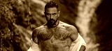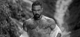 Strong man standing under waterfall rain. Confident man with tattooed body. Intense man portrait with water drops. Powerful man expression in nature.