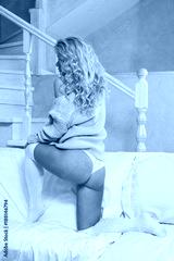 Blonde woman in living room interior