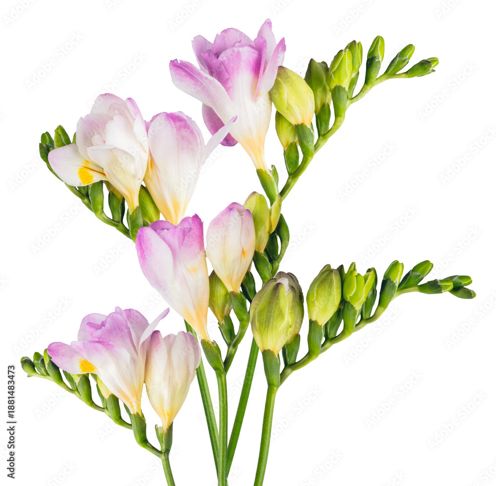 delicate pink and white freesia flowers with buds and green stems on a transparent background, perfect for floral arrangements and designs