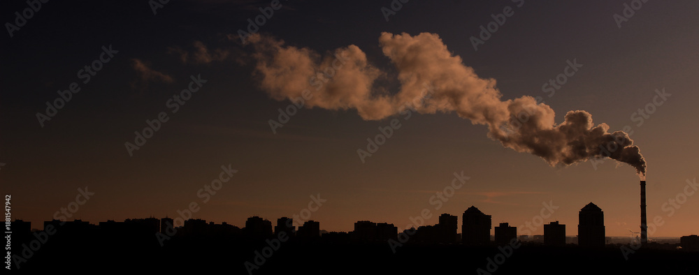 A panorama of a city with high-rise buildings over which a cloud of smoke from a factory chimney hangs late in the evening