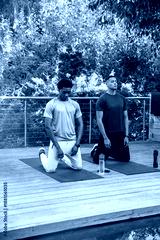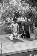 Diverse male friends in sportswear kneeling on yoga mats on wooden deck by pool holding smartphone