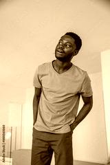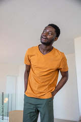 African american man standing near glass railing looking upward in room with cardboard box