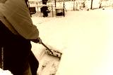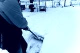 Man removes snow in the yard on a winter morning.