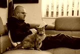 Young man lying on a sofa with a domestic tabby cat reads a book