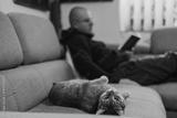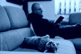 Young man lying on a sofa with a domestic tabby cat reads a book