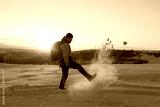Man having fun in snow covered mountain in magic sunset. Active people in nature, adventure concept