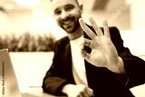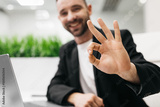 Smiling man in a black blazer showing an okay hand gesture while sitting at a desk with a laptop and greenery in the background during a casual office setting