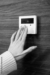 Hand adjusting a modern digital thermostat on a wooden wall, displaying temperature settings and control buttons for climate management in a contemporary home environment