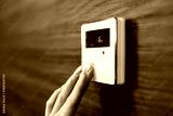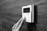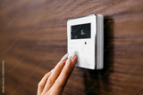 Hand adjusting a modern digital thermostat on a wooden wall, displaying temperature settings and control buttons for efficient climate management in a home environment