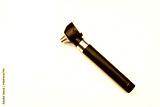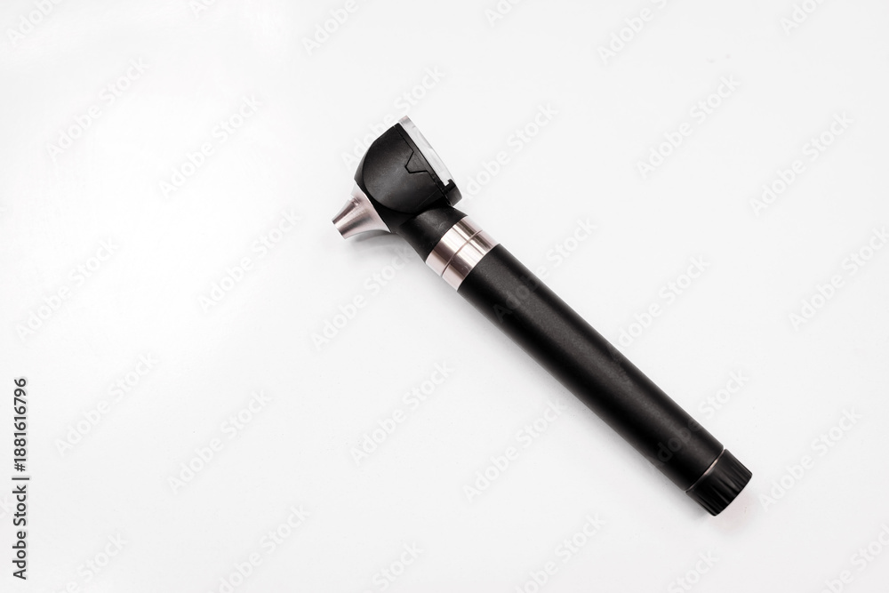 Medical otoscope tool with a black handle and silver accents placed on a white background, used for examining ears in clinical settings with copy space