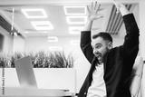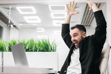 Male office worker in a black blazer is celebrating with raised arms in a modern workspace with greenery and bright lighting during a successful moment at his desk