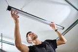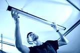 Man in workwear installing a linear LED light fixture on the ceiling indoors. Concept of electrical installation, maintenance work and home renovation.