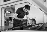 Caucasian young adult man wearing glasses working on car engine in auto repair shop, using tool while inspecting under hood, focused on maintenance task in professional garage setting