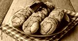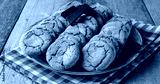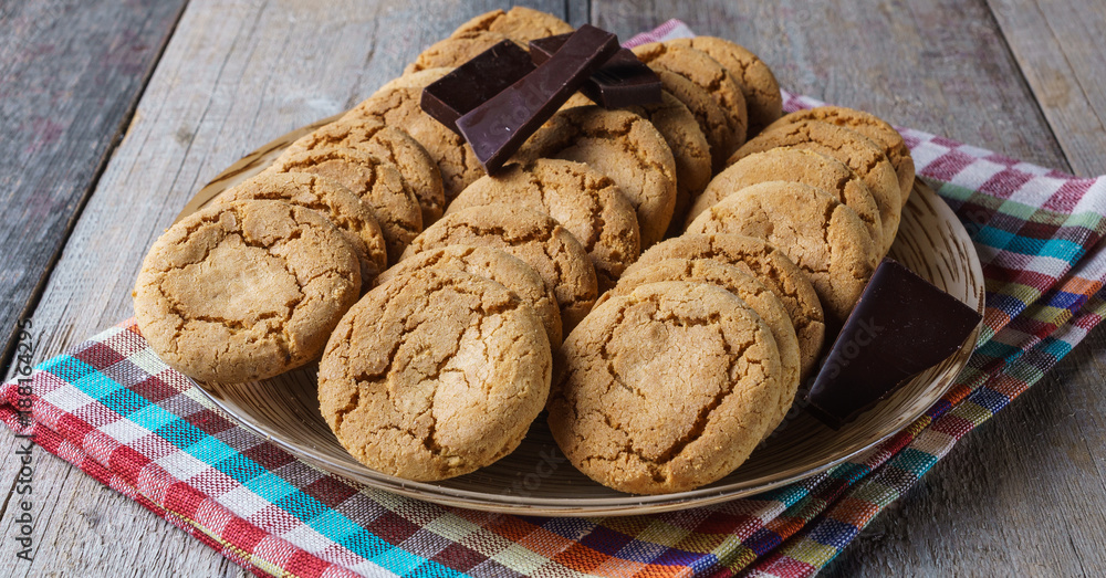 Sweet biscuits on a plate, colored napkin on old wooden Board.
