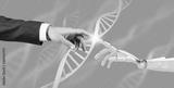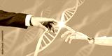 Robotic and human hand touches DNA chain. 3d rendering