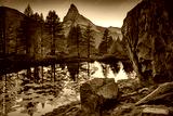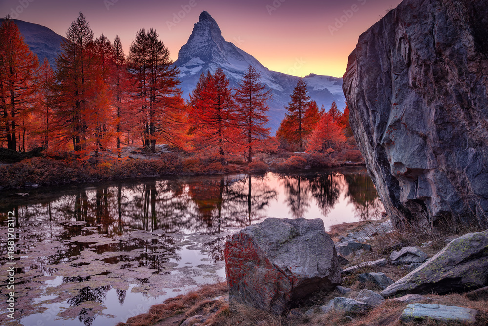 Matterhorn, Swiss Alps, Switzerland. Landscape image of Swiss Alps with Grindjisee and iconic peak Matterhorn in the background at beautiful autumn sunset.