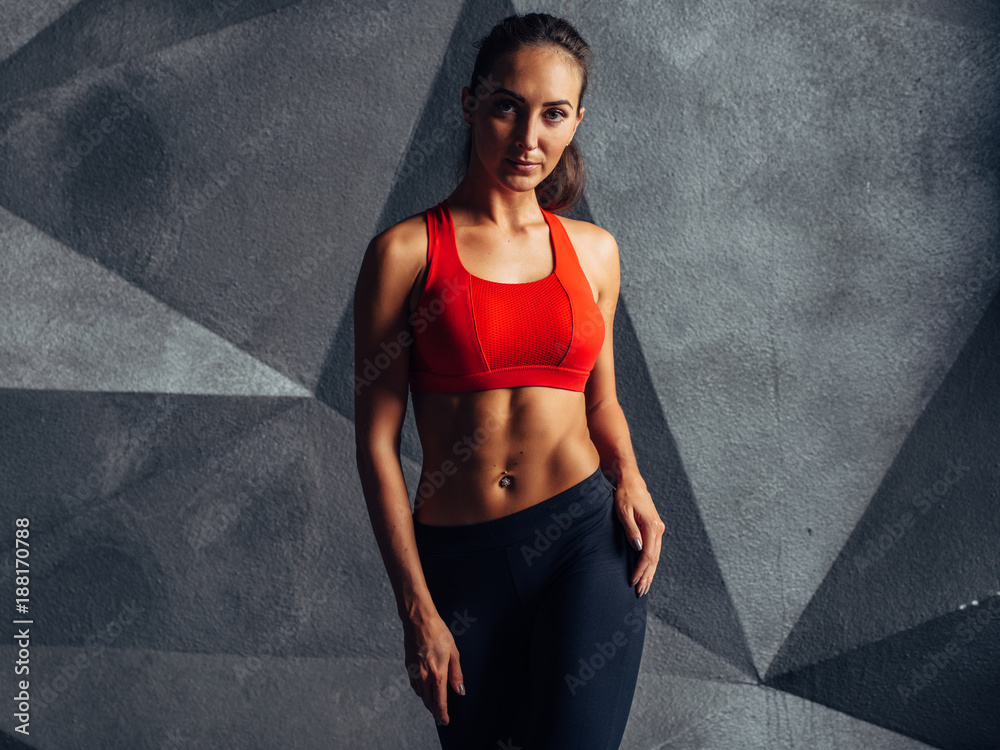 Portrait of fit woman standing, posing, showing her muscular body. Fitness and sport