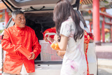 Happy asian family preparing for travel at car trunk during Chinese New Year, Senior parents and daughter loading gifts into white car, Road trip, holiday homecoming and transportation concept