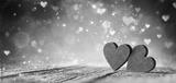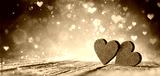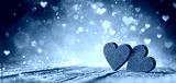 Valentines Day - Two Red Hearts On Wooden Table With Purple Glitter And Abstract Shiny Lights