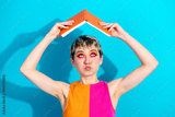Young woman balances an orange book over her head a vibrant fashion portrait against a bright blue background
