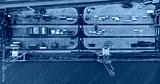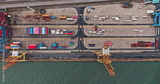 Top down rows of colorful shipping containers and gantry cranes at busy industrial port during daytime, illustrating global logistics and freight transportation. High angle aerial drone view flight