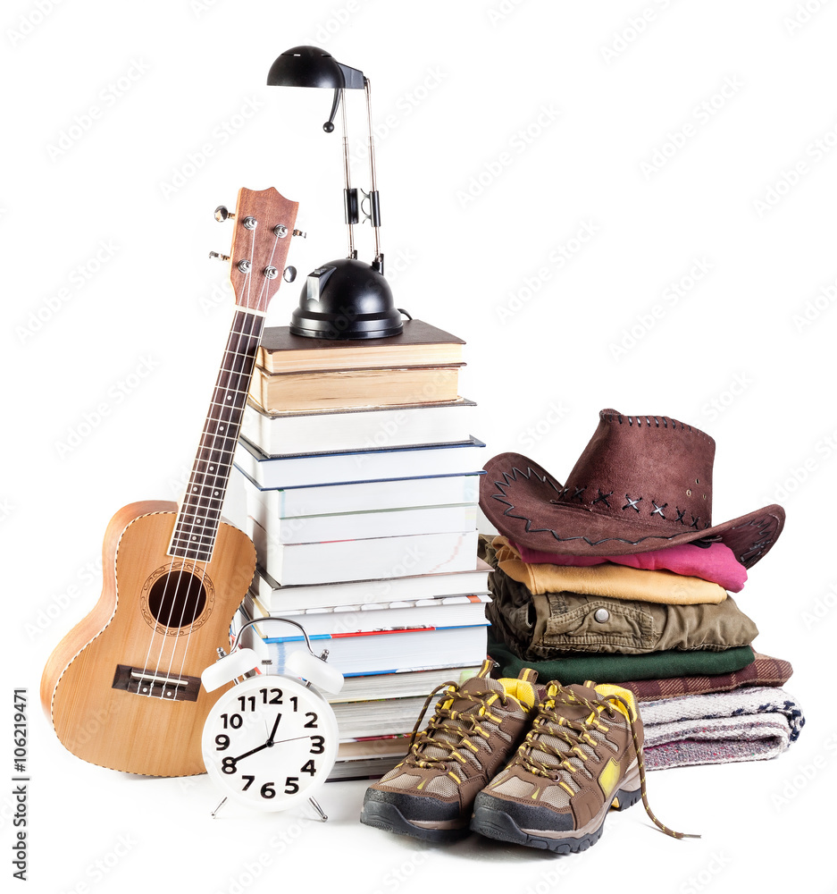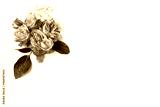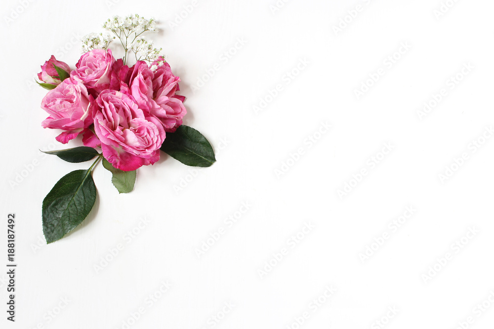 Decorative floral composition with pink roses, green leaves and and baby's breath Gypsophila flowers on white table background. Flat lay, top view. Wedding or birthday styled stock photo.