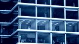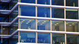 A modern tall building made of steel and glass, housing offices and financial institutions. Glass wall on the facade of the building.