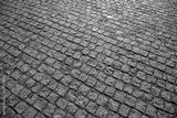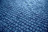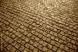 The textured surface of a cobblestone street reflecting bright sunlight serves as an abstract background.