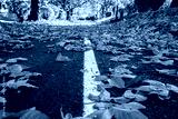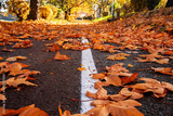 A paved path covered in fallen orange maple leaves divided by a crisp white line during a sunny autumn day.