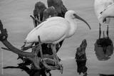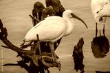 A white bird is standing on a branch in the water. The bird is looking to the right