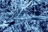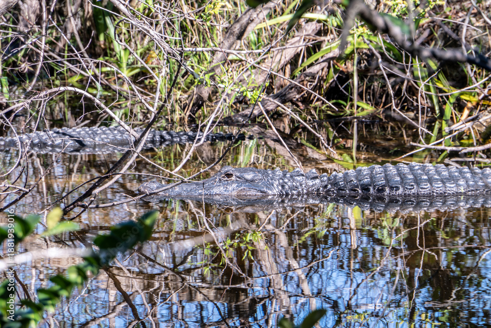 A crocodile is swimming in a pond. The water is calm and the sun is shining brightly
