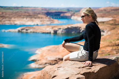 Beautiful young tourist woman watching lake Powell amazing panorama. Famous touristic places in USA. American city travel concept.
