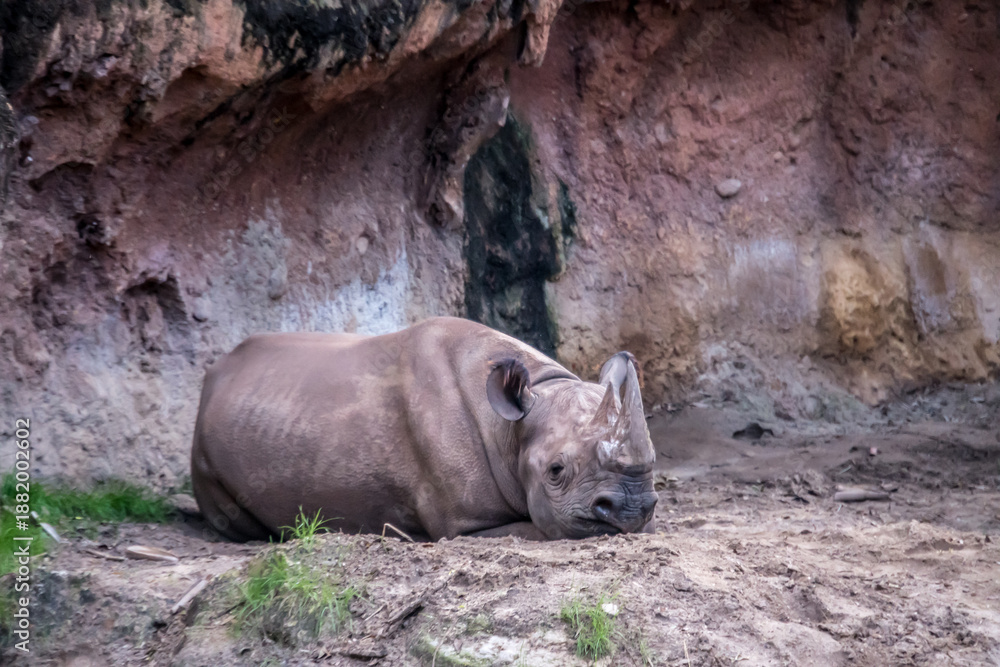 A rhino is laying down in a dirt field. The rhino is resting and he is tired