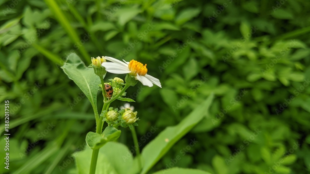 A bright white and yellow wildflower blooms prominently, featuring a ladybug climbing near the delicate petals and buds.