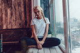 Beautiful girl with two braids in a white T-shirt. Mock-up.