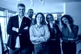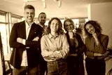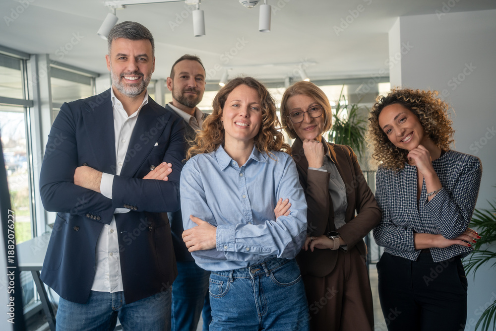 Happy diverse business people team standing together in office, group portrait. Smiling multiethnic international young professional employees company staff with older executive leader look at camera.