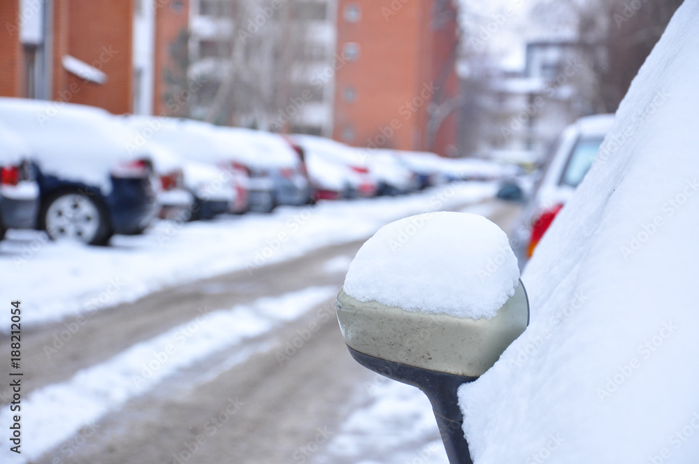 Snow on rearview mirror. Concept of driving in winter time with snow on road