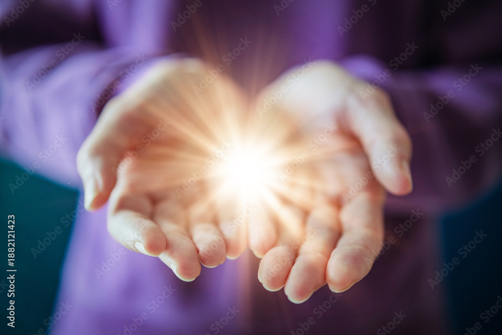 Woman Holding Glowing Light in Open Hands as Give to Gain Symbol of Empowerment and Sharing