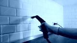 Person cleaning kitchen wall tiles with steam cleaner. Professional cleaner using a steam cleaner to sanitize and wash the white tile grout in a modern kitchen, removing dirt and germs