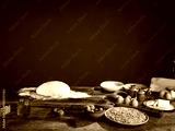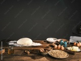 In a charming kitchen, a ball of dough rests on a wooden surface, surrounded by eggs, flour, and other ingredients, ready for baking delicious treats together