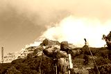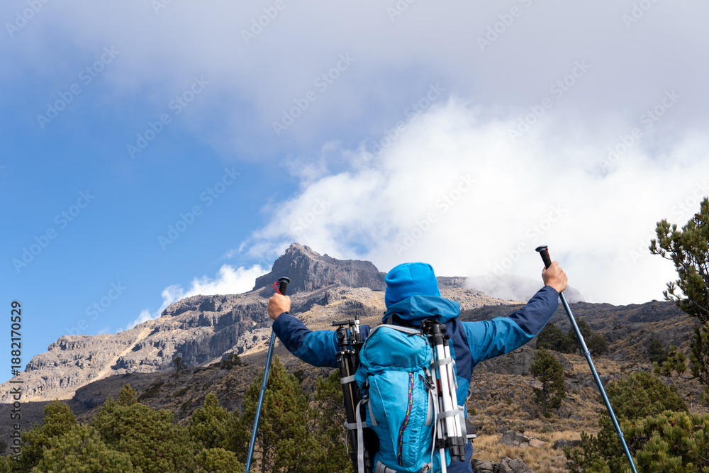 Hiker celebrating reaching iztaccihuatl volcano summit in mexico