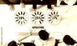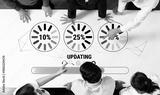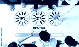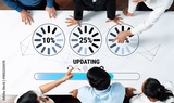 Business professionals work together at a table, analyzing data updates shown on progress indicators, emphasizing teamwork and modern strategies in a corporate environment. Trope