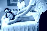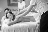 Happy couple getting back massage at spa