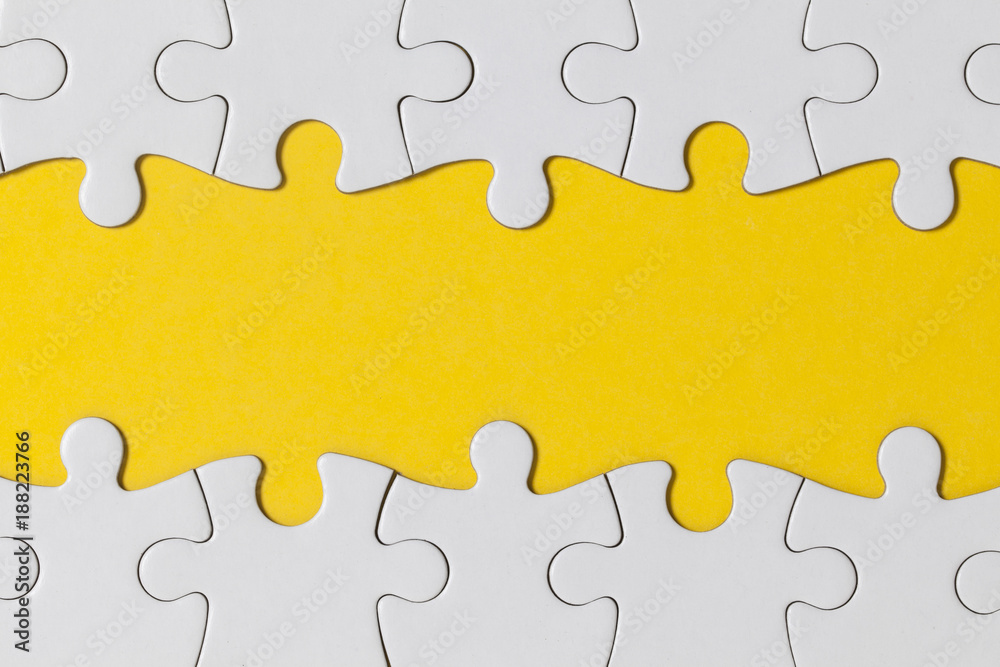 White jigsaw puzzle pieces on a yellow background. Business solution concept