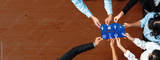 Diverse group of professionals engaging in a collaborative puzzle activity, symbolizing teamwork and innovation in a modern business environment. Amity