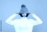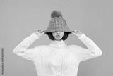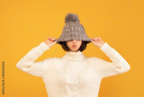 Pretty young woman pulling down woollen hat, showing kissing lips, fooling and posing to camera over yellow background. Happy lady in fashionable winter outfit being silly