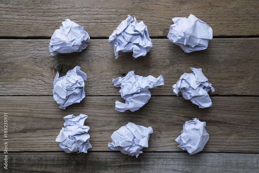 collection of various crumpled paper on wood table background