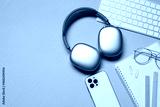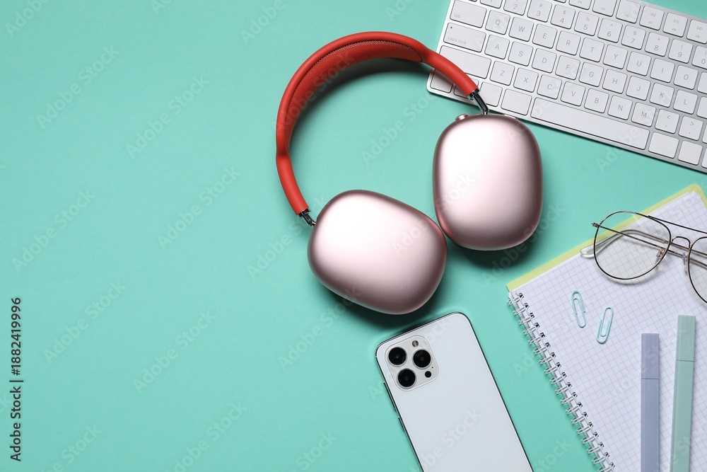 Headphones, computer keyboard, smartphone and stationery on turquoise background, flat lay. Space for text